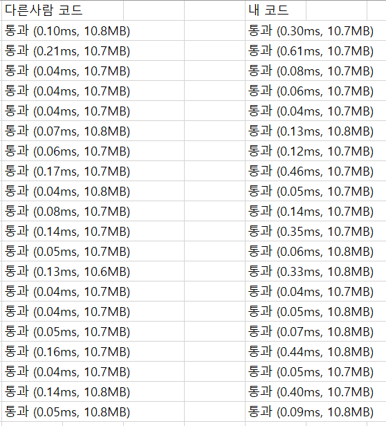 비교를 해보니, 다른 사람의 코드가 내 코드보다 실행 시간이 2~3배 정도 적은 것을 알 수 있었다. 이 정도 차이가 의미가 있는지 없는지 잘은 모르지만, 코딩테스트에서는 효율성 또한 고려를 해줘야 하므로, 가벼이 지나치지 않아야한다. 그래서 보니, 내 코드는