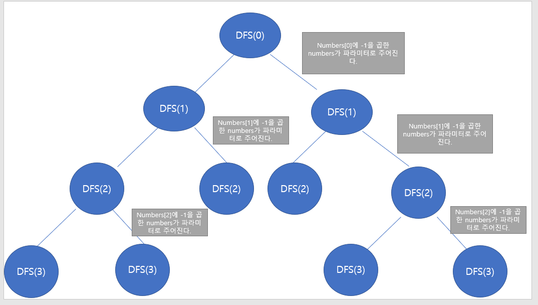 - 그렇지 않다면, dfs(numbers, target, length, i+1)을 호출한 뒤, numbers[i]의 값에 -1을 곱한 채로 dfs(numbers,target, length, i+1)을 호출한다.
