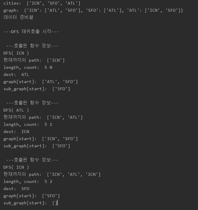 - sub_graph[start] = sub_graph[start][:i] + sub_graph[start][i+1:] 이 과정을 꼭 해야 한다. 즉, ICN 에서 ATL로 이동했다면, ICN에서 ATL로 가는 티켓을 이용한 것이므로, sub_graph[ICN] = [ATL, SFO]에서 ATL을 빼줘야 한다. 그러면 sub_graph[ICN] = [SFO]가 되고, 이 값을 파라미터로 넘겨준다.