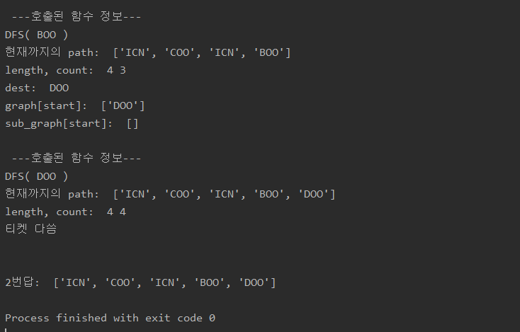 잘못된 경로인 ICN - BOO - DOO 로 들어갔다가, 잘 빠져나와서 올바른 답을 출력한다.