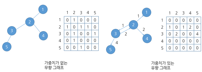 - 간선에 가중치가 있다면, 인접행렬에 1이 아닌 다른 값이 있을 수 있다.