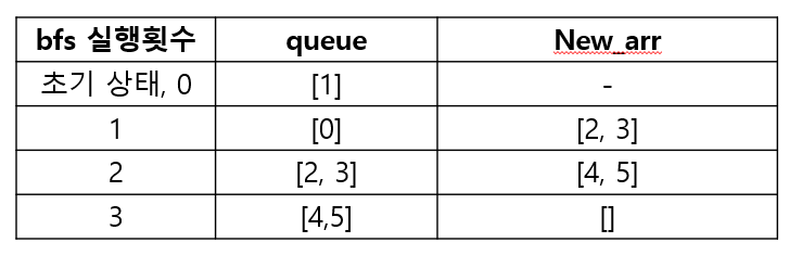 위 표에서, 3번 BFS를 하고 난 뒤 만들어지는 new_arr이 비어있으므로, 더이상 반복을 하지 않고 중단한다.